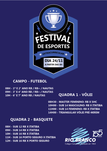 No sábado, dia 24 de novembro, a partir das 8h, o Colégio Rio Branco vai promover o Festival de Esportes Extracurricular. Confira o cronograma de
